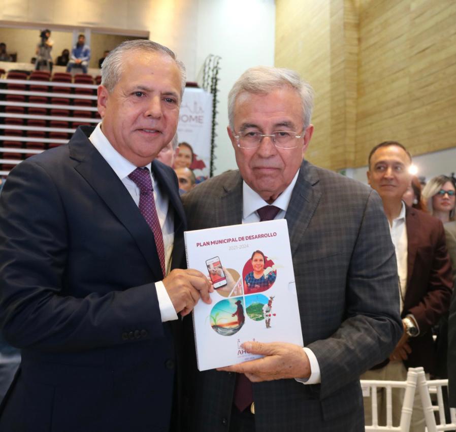 Cobijado por cientos de personas que se dieron cita al auditorio del CIE para asistir a la presentación del Plan Municipal de Desarrollo Ahome 2021-2024, en donde el alcalde de Ahome estuvo acompañado por el Gobernador de Sinaloa, doctor Rubén Rocha Moya; a quien hizo entrega oficial del libro que contiene las líneas estrategias del PMD.