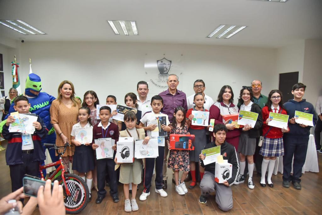 Los Mochis, Ahome, Sinaloa, a 27 de Marzo del 2023.- Niños, niñas, adolescentes y jóvenes participantes en el concurso de dibujo y tik tok, convocado por la Junta de Agua Potable y Alcantarillado del Municipio de Ahome (JAPAMA), con motivo del Día Mundial del Agua, recibieron premios y reconocimientos de manos del Alcalde Gerardo Octavio Vargas Landeros.