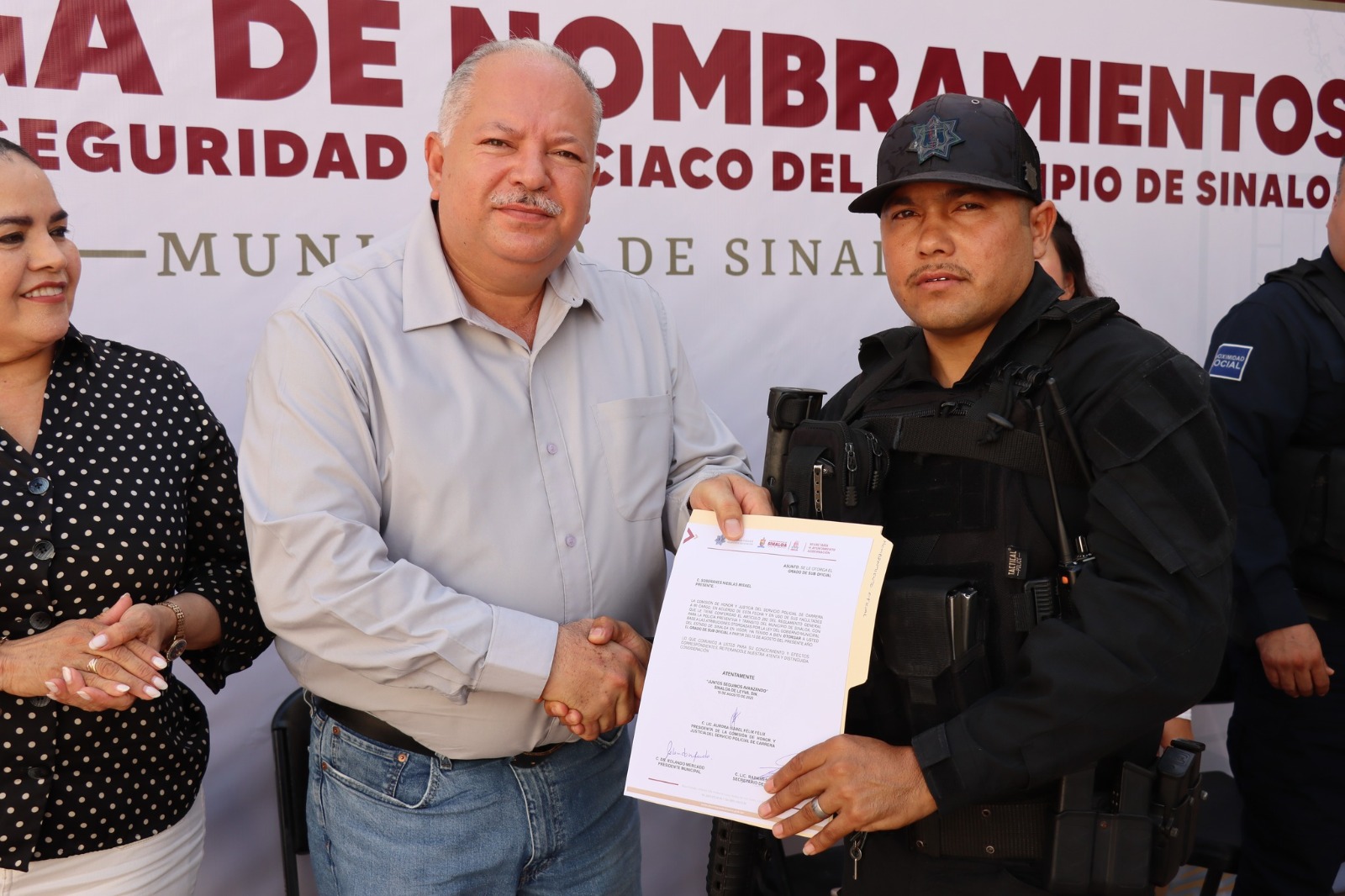 Sinaloa de Leyva, Sin.- Esta mañana, el presidente municipal de Sinaloa, Rolando Mercado, acompañado del secretario del Ayuntamiento, Radamés Véliz Quiñónez, encabezó la entrega de nombramientos a 50 elementos de Seguridad Pública del municipio de Sinaloa.